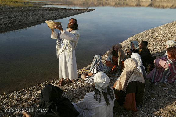 rocky, christ, Jesus, bless, blessing, lake, river, bread, crowd, beach, basket, fish, smile, smiling, group, headdress, arm