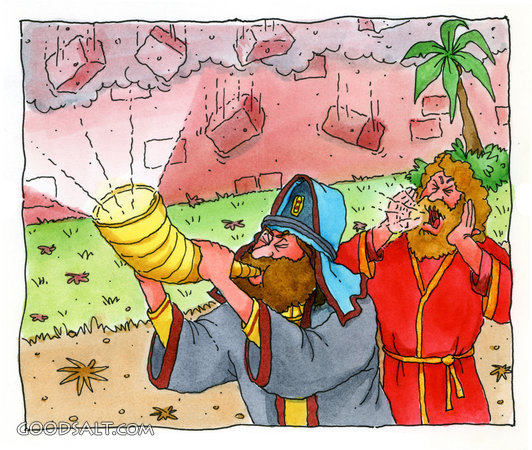 The Fall of Jericho Joshua 6:20-21 march, marching, shout, jericho, horn, priests, walls, hochstatter, daniel j. hochstatter, walls fall down, jericho walls, ram's horn PROJECTION - License for PowerPoint™ PRINT – buy a print of this picture; optional frame Bible Hub |