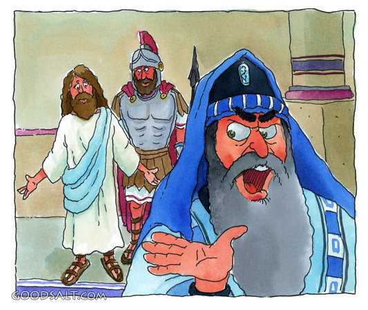 Jesus, innocent, trial, guilty, angry, guard, Caiaphas, jesus trial, hochstatter, daniel j. hochstatter