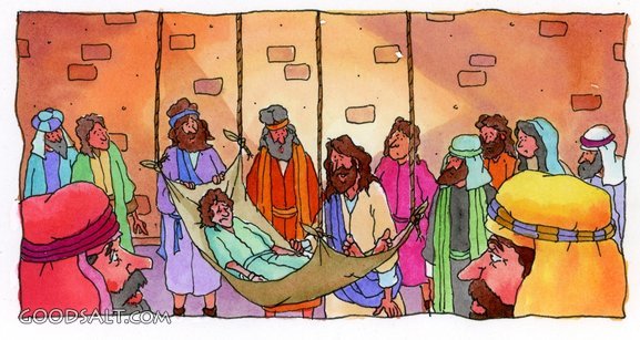 Through the Roof Mark 2:4 Mark 2:10-11 heal, faith, crowd, hochstatter, daniel j. hochstatter, paralyzed man, heals paralyzed man, through roof, sins forgiven PROJECTION - License for PowerPoint™ PRINT – buy a print of this picture; optional frame Bible Hub |