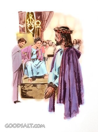 Jesus Before Governor Pilate John 19:1-15 Mark 15:17-20 Matthew 27:28-31 Luke 23:1-25 christ, Jesus, bound, robe, mocking, judgment, pilate, easter, crown of thorns PROJECTION - License for PowerPoint™ PRINT – buy a print of this picture; optional frame Bible Hub |