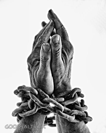 Praying Hands in Chains Ephesians 6:18-20 captive, shackled, prayer, man, trapped, freedom, slave, hurting, hands, chains, heavy-laden, white background, weight on man, black & white photo PROJECTION - License for PowerPoint™ PRINT – buy a print of this picture; optional frame Bible Hub |