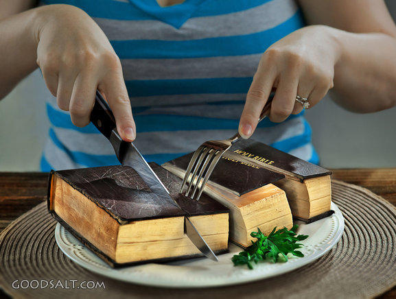 Cutting Up a Bible Revelation 22:19 surreal, consume, read, page, plate, bible, book, table, cut, eat, library, woman, knife, food, holy, meal, religion, christian, concept, word, dinner, slice, steak PROJECTION - License for PowerPoint™ PRINT – buy a print of this picture; optional frame Bible Hub |