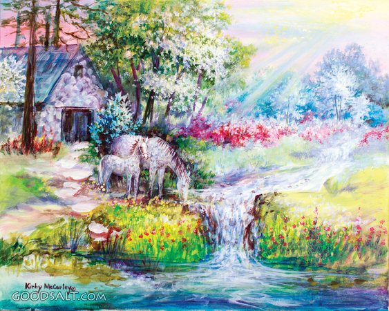 Beside Streams of Living Water Psalm 65:9 joyful, barn, animals, horses, country setting, idyllic, streams, landscape painting, acrylic painting, stream of water, spiritual lesson on water, streams of living water, peaceful country scene PROJECTION - License for PowerPoint™ PRINT – buy a print of this picture; optional frame Bible Hub |