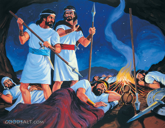 David Spares Saul 1 Samuel 26:5-12 asleep, touch, lying, don't, collection, stop, saul, spear, king, fire, ready, david, to, into, soldiers, Abishai, holds, says, Spares, Stands, by, nearby, lifeway, ron hester, poised, thrust, lfwas0186 PROJECTION - License for PowerPoint™ PRINT – buy a print of this picture; optional frame Bible Hub |