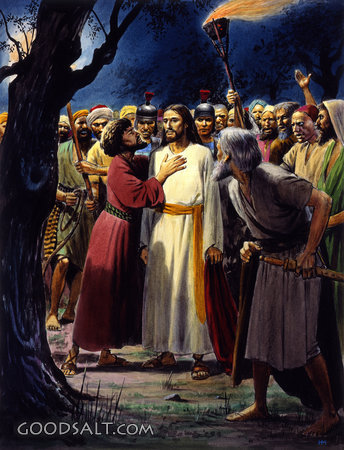 The Betrayal Matthew 26:47-50 Mark 14:43-46 Luke 22:47-48 John 18:2-3 Jesus, traitor, betrayal, collection, judas, crowd, gethsemane, garden, capture, swords, torches, lifeway, lfwas1512 PROJECTION - License for PowerPoint™ PRINT – buy a print of this picture; optional frame Bible Hub |