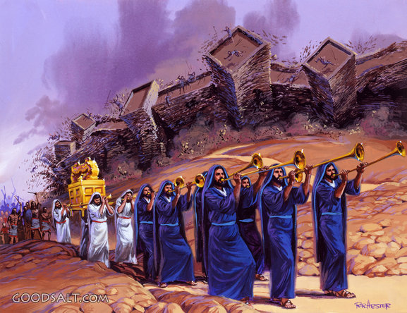 Jericho Falls Joshua 6:1-27 down, collection, trumpet, march, battle, destroyed, ark, jericho, horn, covenant, falls, walls, collapse, tumbling, lifeway, lfwas1621 PROJECTION - License for PowerPoint™ PRINT – buy a print of this picture; optional frame Bible Hub |