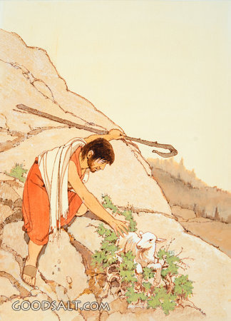 Shepherd Rescues Lost Lamb Luke 15:3-17 lost, rocky, holding, found, caught, cane, over, collection, bending, hillside, shepherd, sheep, tired, thicket, in, lifeway, lfwas2251, bedraggled PROJECTION - License for PowerPoint™ PRINT – buy a print of this picture; optional frame Bible Hub |
