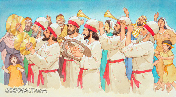 The Priests Blow Their Trumpets Joshua 6:2-6 following, people, playing, collection, marching, around, white, red, jericho, children, robes, priests, harps, cymbals, trumpets, trim, lifeway, lfwas2293 PROJECTION - License for PowerPoint™ PRINT – buy a print of this picture; optional frame Bible Hub |