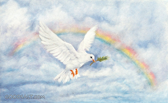 Spirit of Peace, Dove Olive Branch Rainbow Genesis 8:1-12 Genesis 9:9-17 sky, peaceful, peace, rainbow, dove, promise, spirit, flight, clouds, holy spirit, olive twig, wings of white dove PROJECTION - License for PowerPoint™ PRINT – buy a print of this picture; optional frame Bible Hub |
