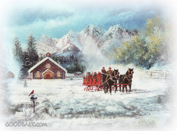 sleigh, rural, country, church, snow, winter, snowing, cold, log, mountains, horses