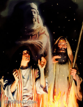 Witch of Endor 1 Samuel 28:12-16 flame, dead, communicate, conjure, woman, man, medium, guidance, fear, foreboding, scared, disguise, endor, forbidden, magic, occult, spiritualism, ghost, samuel, saul, smoke, sorceress, spirit, king, disobedient, prophet, fire, satanic, frightened, evil, witch, witchcraft PROJECTION - License for PowerPoint™ PRINT – buy a print of this picture; optional frame Bible Hub |