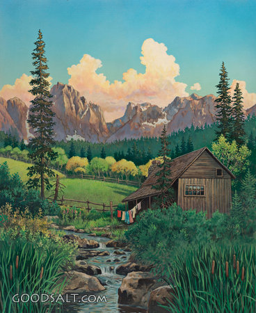 The Mountain Cabin Revelation 12:6 pond, nature, rural, mountain, field, home, creek, stream, cabin, homestead, meadow, clouds, clothesline, old fashioned PROJECTION - License for PowerPoint™ PRINT – buy a print of this picture; optional frame Bible Hub |