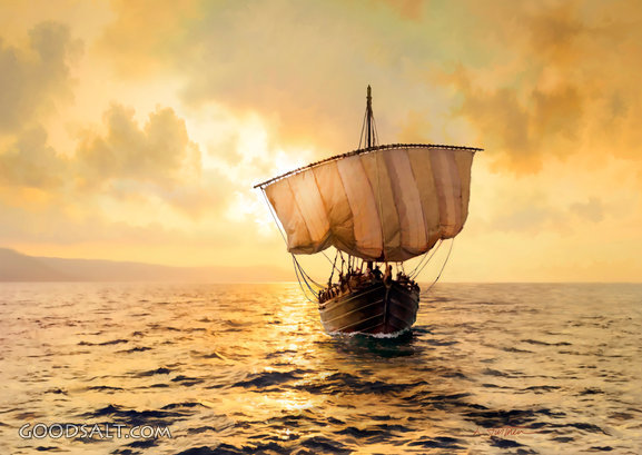 Bible Era Ship Acts 27:1 yellow, journey, sunrise, sunset, boat, ship, paul, sail, sailing, missionary, gold, lars, Mediterranean, great sea, mission trip PROJECTION - License for PowerPoint™ PRINT – buy a print of this picture; optional frame Bible Hub |