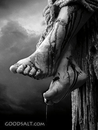 Jesus' Feet Nailed to the Cross. Luke 23 die, crucifix, cloudy, christ, Jesus, nailed, hang, drip, feet, blood, storm, foot, death, cross, bloody, rope, easter, crucifixion, crucify, art, images, Pictures, pics PROJECTION - License for PowerPoint™ PRINT – buy a print of this picture; optional frame Bible Hub |