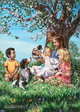 Jesus Wih Children Matthew 19:14 Mark 10:14 Luke 18:16 playing, Jesus, grass, animal, girl, child, boy, kid, tree, puppies, dog, puppy, art, children, love, images, john steel, Pictures, pics PROJECTION - License for PowerPoint™ PRINT – buy a print of this picture; optional frame Bible Hub |