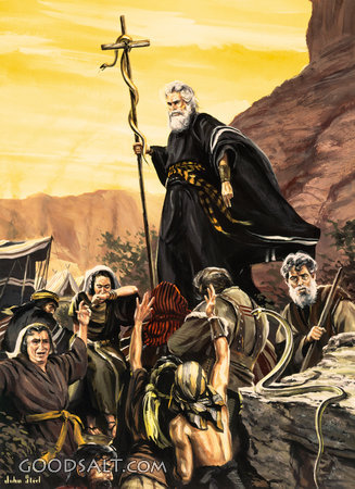 Moses Lifts Up the Bronze Serpent in the Desert. Numbers 21:6-9 die, desert, israelite, poison, poisonous, bronze, snake, faith, cross, serpent, exodus, plague, venomous, moses PROJECTION - License for PowerPoint™ PRINT – buy a print of this picture; optional frame Bible Hub |