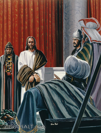 Jesus Before the Sanhedrin Mark 14:53-65 John 18:12-25 Luke 22:66-71 christ, Jesus, talk, talking, persecution, ask, asking, men, trial, soldier, roman, arrest, night, guard, easter, priests, Caiaphas, Annas, john steel, passion week PROJECTION - License for PowerPoint™ PRINT – buy a print of this picture; optional frame Bible Hub |