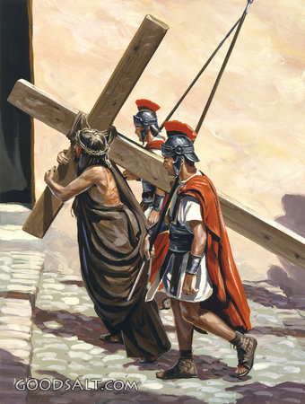 Jesus Carries Cross Mark 15:20 John 19:17 walk, carrying, christ, Jesus, man, men, street, simon, soldier, roman, cross, pole, from, easter, passion, carry, art, images, john steel, passion week, Pictures, pics PROJECTION - License for PowerPoint™ PRINT – buy a print of this picture; optional frame Bible Hub |