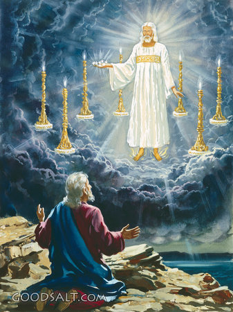 The Seven Churches Revelation 1:11-16 christ, Jesus, ocean, john, vision, revelation, island, patmos, rocks, stars, clyde provonsha, candlesticks, lampstands, pacific press publishing PROJECTION - License for PowerPoint™ PRINT – buy a print of this picture; optional frame Bible Hub |