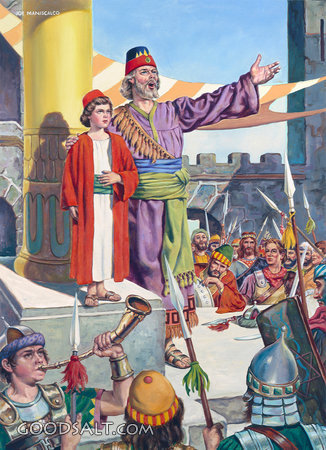 celebration, joash, announcement, soldiers, trumpets, king joash, pacific press publishing