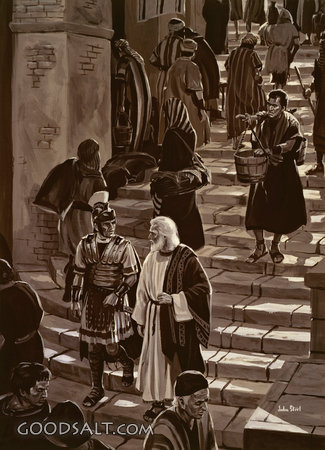Paul and Roman Commander Acts 22:28-30 city, conversation, roman, communication, citizenship, john steel, city street, steps, paul and roman, paul and soldier, paul talking, pacific press publishing, js-0247 PROJECTION - License for PowerPoint™ PRINT – buy a print of this picture; optional frame Bible Hub |