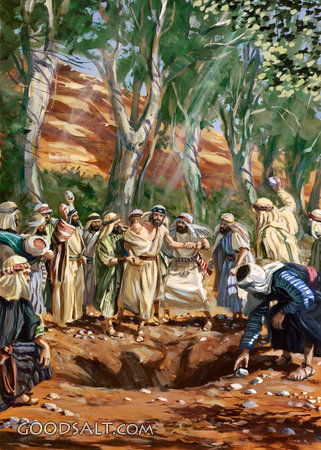punishment, stoning, violent, crowd, pit, prisoner, mob, stones, john steel, stoned, pacific press publishing, js-0331