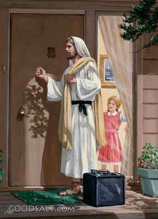 knock, knocking, christ, Jesus, girl, child, door, briefcase, john steel, pacific press publishing, js-0390