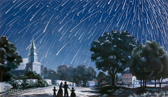 Meteor Shower of 1833 in Virginia Matthew 24:29 Mark 13:25 Revelation 6:13 falling, meteor, shower, end, last, signs, times, stars, days, heavens, 1833, pacific press publishing PROJECTION - License for PowerPoint™ PRINT – buy a print of this picture; optional frame Bible Hub |