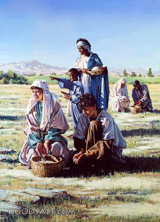 manna, looking, gathering, gathering manna, woman with children, gathering grain