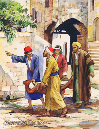 Four Friends Carrying Man with Palsy Matthew 9:1-8 Mark 2:1-12 Luke 5:17-26 carrying, Jesus, paralyzed, testament, crippled, man, new, roof, palsy, friends, Dorothy Handsaker-Scott, Healings, 00233 PROJECTION - License for PowerPoint™ PRINT – buy a print of this picture; optional frame Bible Hub |