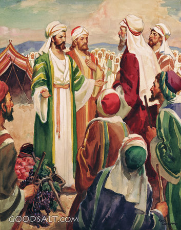 Caleb and Joshua before Moses with Fruits Numbers 13 testament, law, old, joshua, moses, spies, caleb, canaan, genesis, numbers, fruits, Deuteronomy, Karl Godwin, 00552 PROJECTION - License for PowerPoint™ PRINT – buy a print of this picture; optional frame Bible Hub |