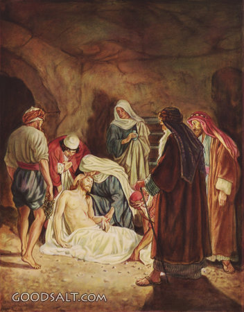Joseph of Arimathea Lays Jesus' Body in His Tomb Matthew 27:57-61 Mark 15:42-47 Luke 23:50-55 John 19:38-42 week, Jesus, arimathea, testament, buried, tomb, joseph, body, new, death, easter, passion, William Brassey Hole, Lays, 00584 PROJECTION - License for PowerPoint™ PRINT – buy a print of this picture; optional frame Bible Hub |