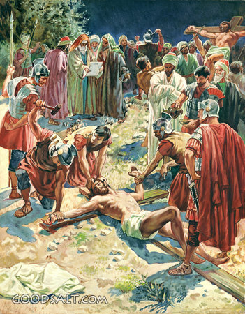 Jesus Is Crucified at Calvary Matthew 27:33-44 Mark 15:22-32 Luke 23:33-38 John 19:17-25 calvary, golgotha, crucified, week, Jesus, testament, new, death, cross, easter, passion, crucifixion, William Brassey Hole, Scourged, 00817 PROJECTION - License for PowerPoint™ PRINT – buy a print of this picture; optional frame Bible Hub |