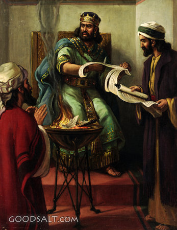 Jehoiakim Burns the Word of God Jeremiah 36 2 Kings 24 god, testament, old, scroll, isaiah, jeremiah, daniel, word, prophets, Jehoiakim, William Fredericks, Major, Burns, 00885 PROJECTION - License for PowerPoint™ PRINT – buy a print of this picture; optional frame Bible Hub |