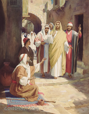 Jesus Healing the Blind Man Matthew 20:29-34 Mark 10:46-52 Luke 18:35-43 blind, Jesus, healing, testament, man, new, Bartimaeus, Healings, Griffith Foxley, 00932 PROJECTION - License for PowerPoint™ PRINT – buy a print of this picture; optional frame Bible Hub |