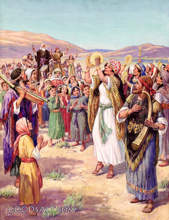 Miriam's Happy Song Exodus 12 Exodus 15 happy, testament, miriam, law, old, freed, egypt, escape, exodus, song, genesis, Hebrews, Deuteronomy, Arthur Ernst Becher, 00999 PROJECTION - License for PowerPoint™ PRINT – buy a print of this picture; optional frame Bible Hub |