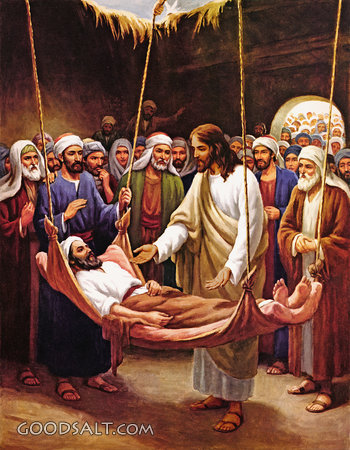 Man Let Down Through Roof Matthew 9:1-8 Mark 2:1-12 Luke 5:17-26 Jesus, paralyzed, testament, crippled, man, new, roof, Healings, Let, William Stecher, 01069 PROJECTION - License for PowerPoint™ PRINT – buy a print of this picture; optional frame Bible Hub |