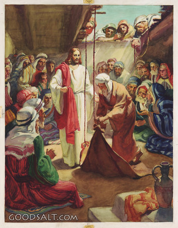 Man Came Through the Roof Matthew 9:1-8 Mark 2:1-12 Luke 5:17-26 Jesus, paralyzed, testament, crippled, man, new, roof, Karl Godwin, Healings, Came, 01690 PROJECTION - License for PowerPoint™ PRINT – buy a print of this picture; optional frame Bible Hub |