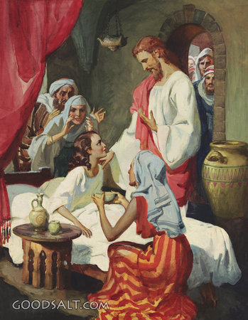 Raising the Daughter of Jairus Matthew 9:18-26 Mark 5:21-43 Luke 8:40-56 dead, Jesus, testament, new, jairus, daughter, raising, Karl Godwin, Healings, 01743 PROJECTION - License for PowerPoint™ PRINT – buy a print of this picture; optional frame Bible Hub |