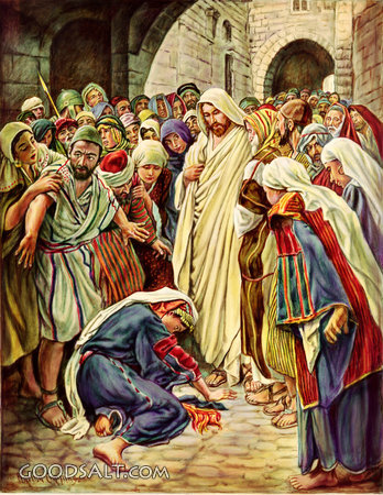 Woman Touched Jesus' Garment Matthew 9:18-26 Mark 5:21-43 Luke 8:40-56 garment, Jesus, sick, testament, woman, new, hemorrhage, touched, Harold Copping, Healings, 01766 PROJECTION - License for PowerPoint™ PRINT – buy a print of this picture; optional frame Bible Hub |