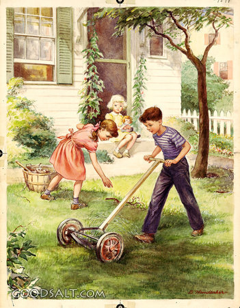 working, boy, lawn, americana, children, outdoors, Dorothy Handsaker-Scott, Mowing, 01897