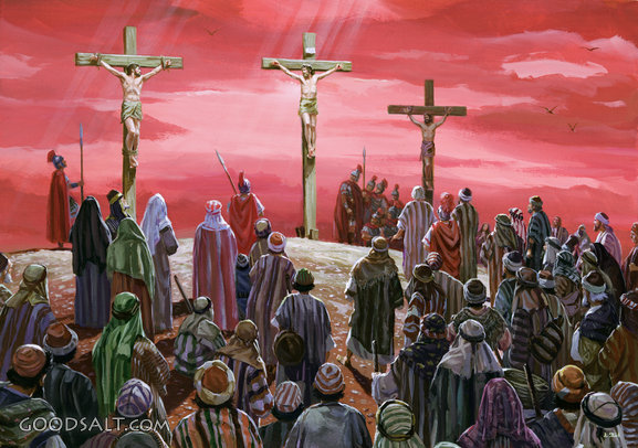 The Crucifixion Luke 23:39-43 calvary, golgotha, crucified, week, Jesus, testament, new, cross, easter, passion, crucifixion, john steel, Scourged, 04960 PROJECTION - License for PowerPoint™ PRINT – buy a print of this picture; optional frame Bible Hub |
