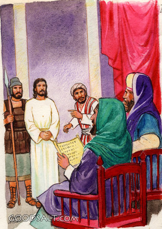 Jesus on Trial John 18:12-14 John 18:19-23 week, Jesus, testament, trial, new, sanhedrin, easter, passion, abused, Interrogated, Scourged, Andre LeBlanc, 05573 PROJECTION - License for PowerPoint™ PRINT – buy a print of this picture; optional frame Bible Hub |