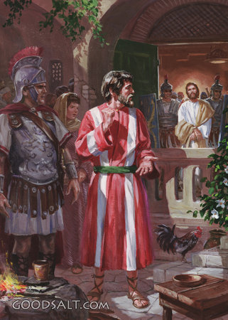Peter's Denial Matthew 26:69-75 Mark 14:66-72 Luke 22:54-62 John 18:15-18 John 18:25-27 christ, Jesus, testament, denial, denies, peter, new, simon, disciples, john steel, 09694 PROJECTION - License for PowerPoint™ PRINT – buy a print of this picture; optional frame Bible Hub |