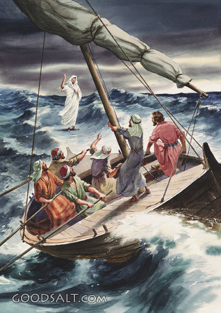 Jesus Walks on Water Matthew 14:22-33 Mark 6:45-54 John 6:15-21 water, Jesus, testament, wind, boat, new, art, disciples, images, miracles, walks, Pictures, Frank Soltesz, 09725, pics PROJECTION - License for PowerPoint™ PRINT – buy a print of this picture; optional frame Bible Hub |