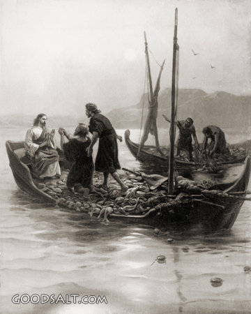 The Draught of Fishes Luke 5:1-11 Jesus, testament, catch, collection, great, new, fish, fishes, miracles, providence, Provides, William Fredericks, Draught, D00172, fis PROJECTION - License for PowerPoint™ PRINT – buy a print of this picture; optional frame Bible Hub |