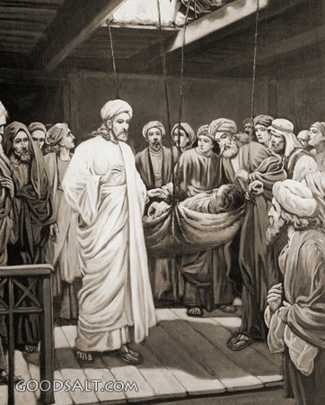 A Paralytic Healed Matthew 9:1-8 Mark 2:1-12 Luke 5:17-26 Jesus, paralyzed, paralytic, testament, crippled, collection, new, healed, roof, providence, Healings, William Fredericks, D00174 PROJECTION - License for PowerPoint™ PRINT – buy a print of this picture; optional frame Bible Hub |