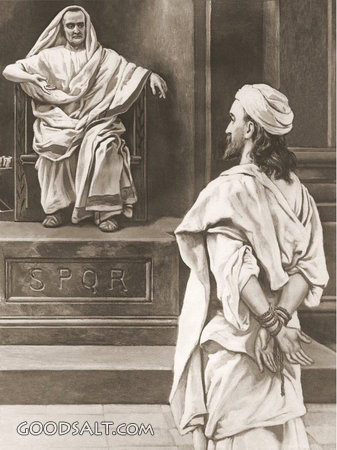 Christ Before Pilate Matthew 27:11-14 Mark 15:1-5 Luke 23:1-5 John 18:28-38 week, christ, Jesus, testament, new, pilate, easter, passion, abused, William Fredericks, Interrogated, Scourged, D00338 PROJECTION - License for PowerPoint™ PRINT – buy a print of this picture; optional frame Bible Hub |