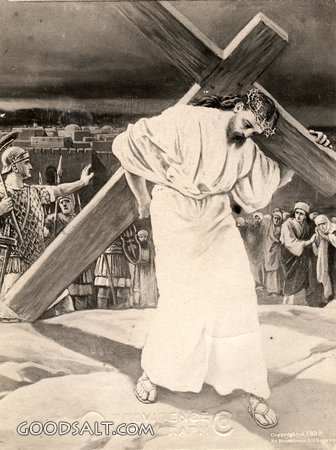 Christ Crucified Matthew 27:32 Mark 15:21 Luke 23:26-32 crucified, week, christ, Jesus, testament, new, cross, easter, passion, carries, William Fredericks, Scourged, D00339 PROJECTION - License for PowerPoint™ PRINT – buy a print of this picture; optional frame Bible Hub |